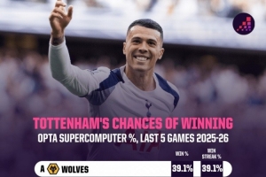 热刺后5轮难度是第6轻松 5连胜概率仅0.23%但预计仅需3胜即可保级