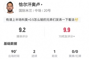 24直播网4月22日讯 国米在意大利杯半决赛次回合3-2逆转科莫,恰尔汗奥卢本场数据如下: