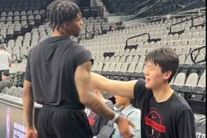 24直播网4月23日讯 昨日开拓者对阵马刺G2赛前,记者周玲安拍到杨瀚森和队友乐福积极互动,并与助教伯勒尔用英文流利沟通。伯勒尔是去年夏联时球队的主帅。