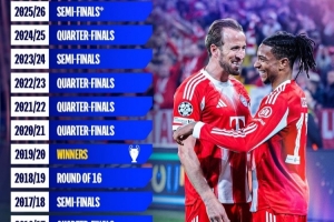 24直播网4月28日讯 欧冠官方晒海报,列出拜仁慕尼黑近年的欧冠淘汰赛战绩,具体如下:
