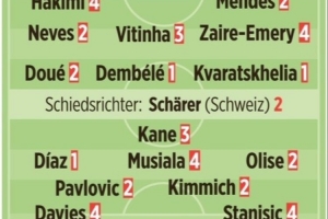图片报赛后评分:K77、迪亚斯、登贝莱均1分最佳 凯恩、诺伊尔3分
