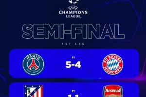 24直播网04月30日讯 欧冠半决赛首回合结束,巴黎5-4拜仁,阿森纳客场1-1战平马竞。